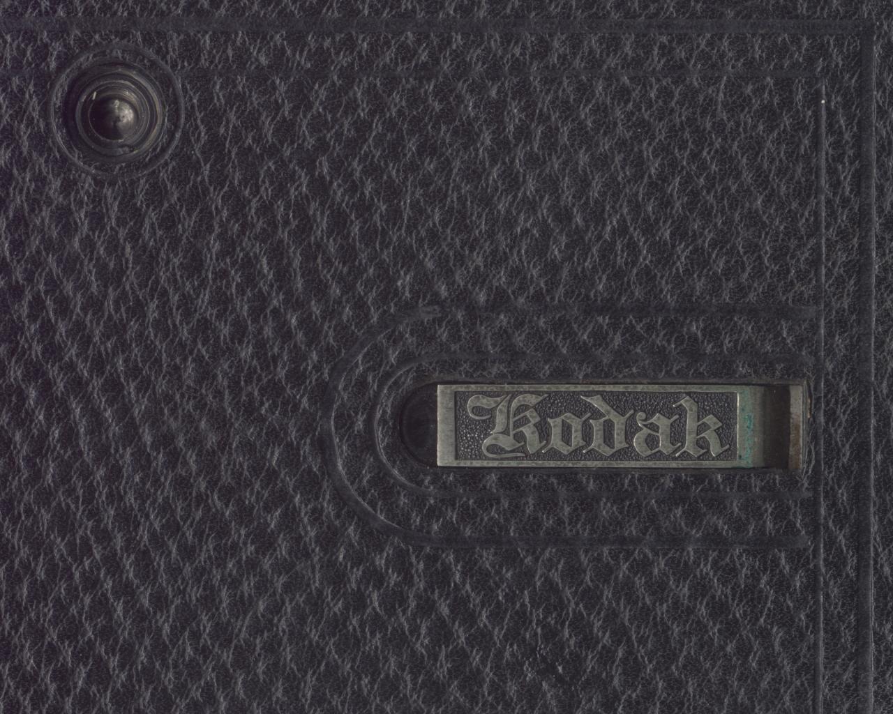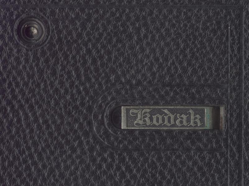 Take a close look at the 2C in the previous image. Do you see the little leg in the lower right that supports the front of the camera when it is opened and placed on a flat surface? The rather ornate "Kodak" logo in this image is this little leg in the folded up position. The concentric circles in the top left corner of the image is the 1/4" tripod screw hole.