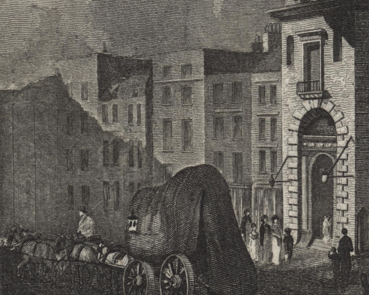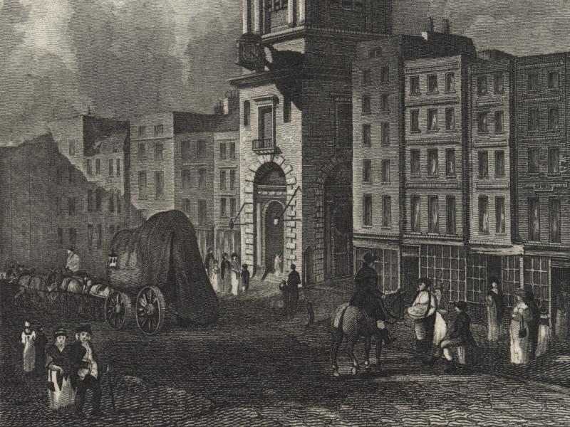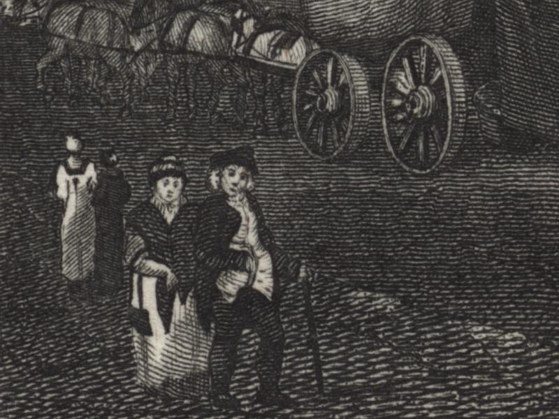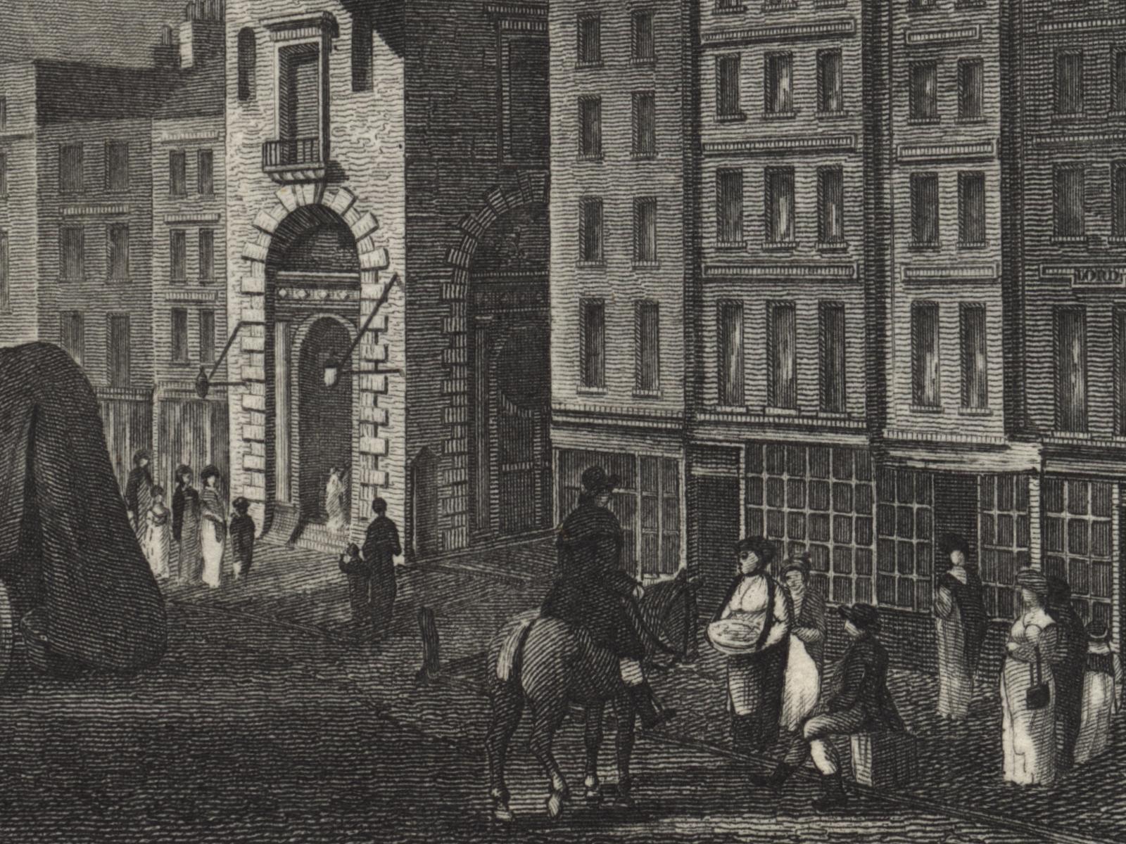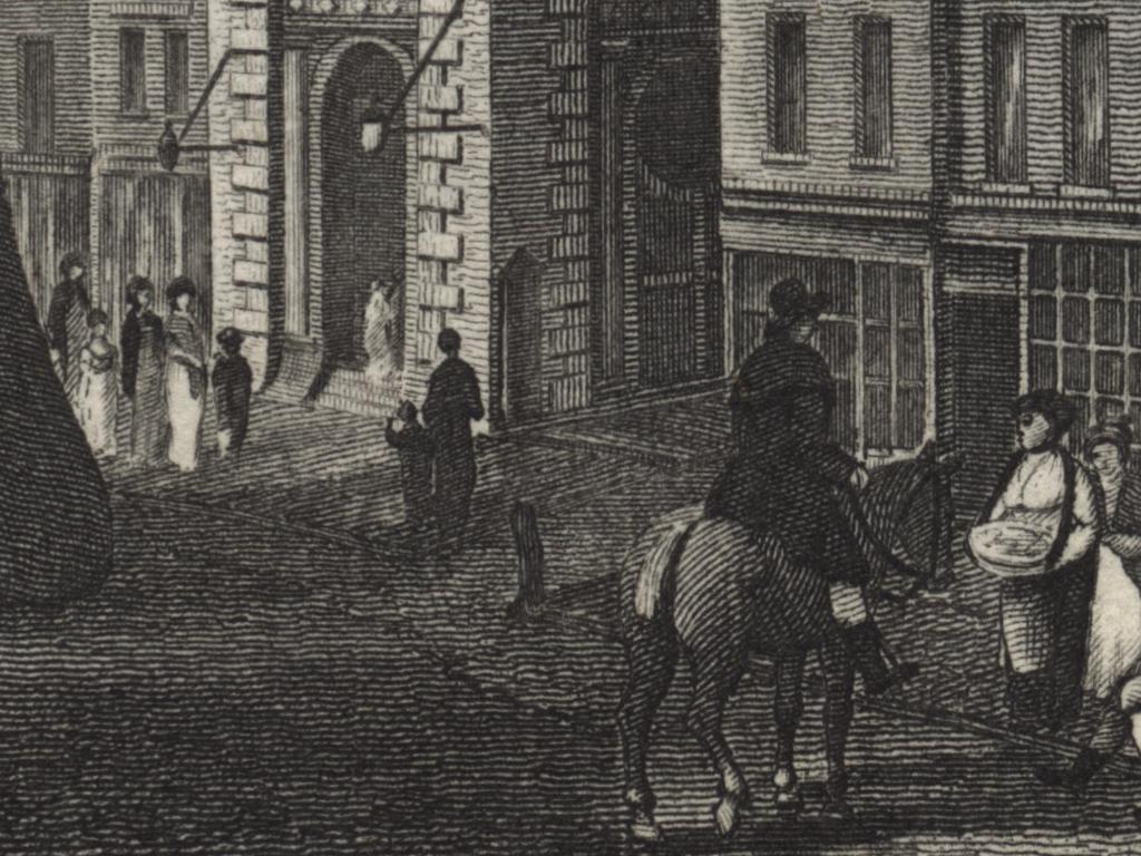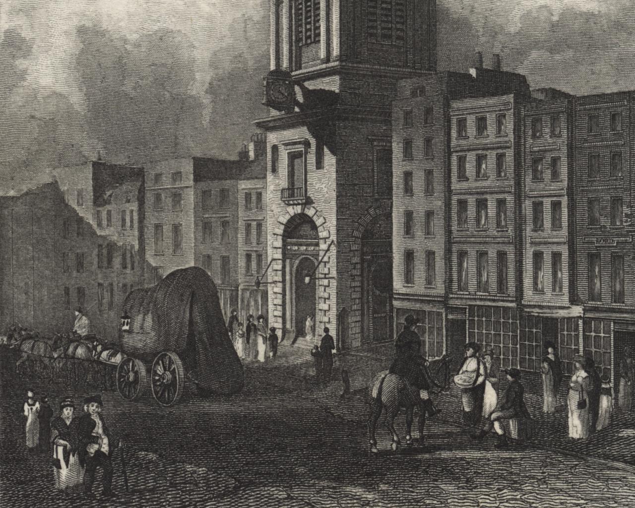 Here's a 800x600 clipping from the above steel engraving of the Bow Church focused on the street scene.