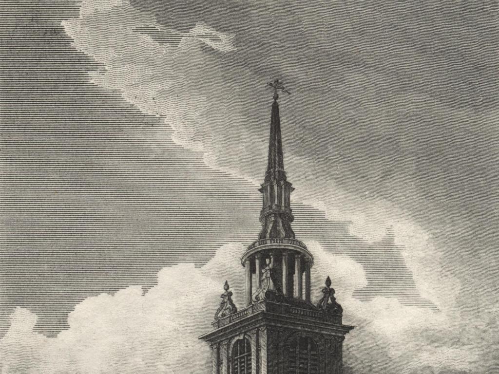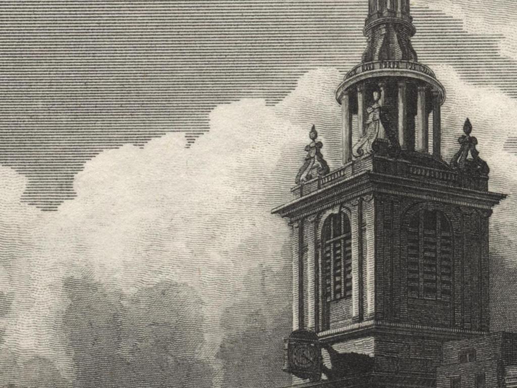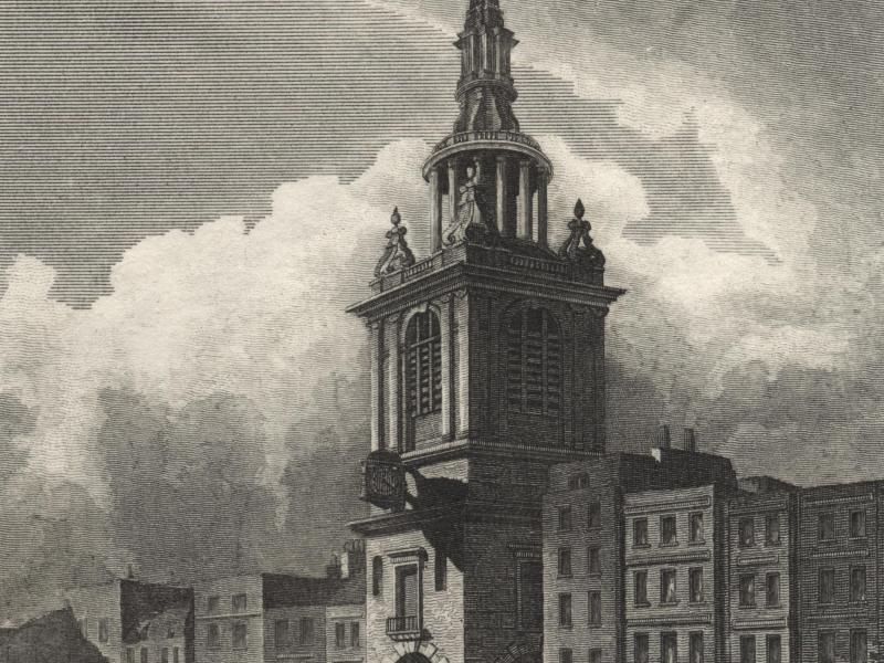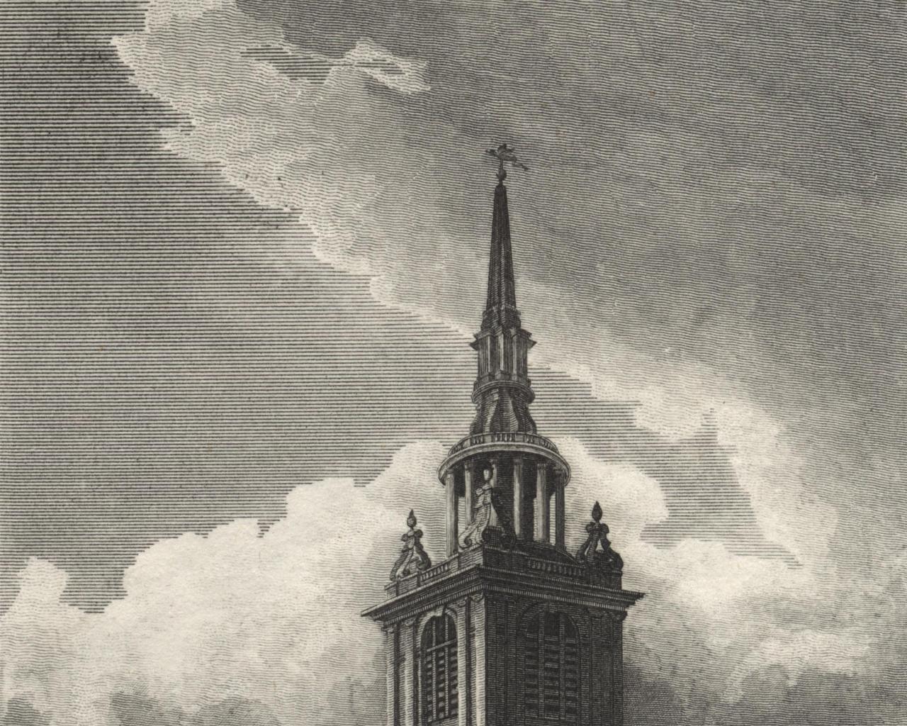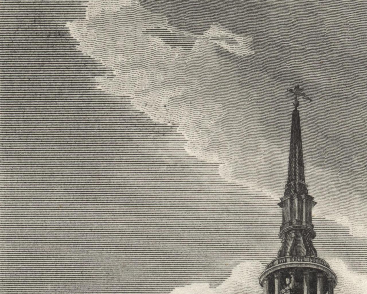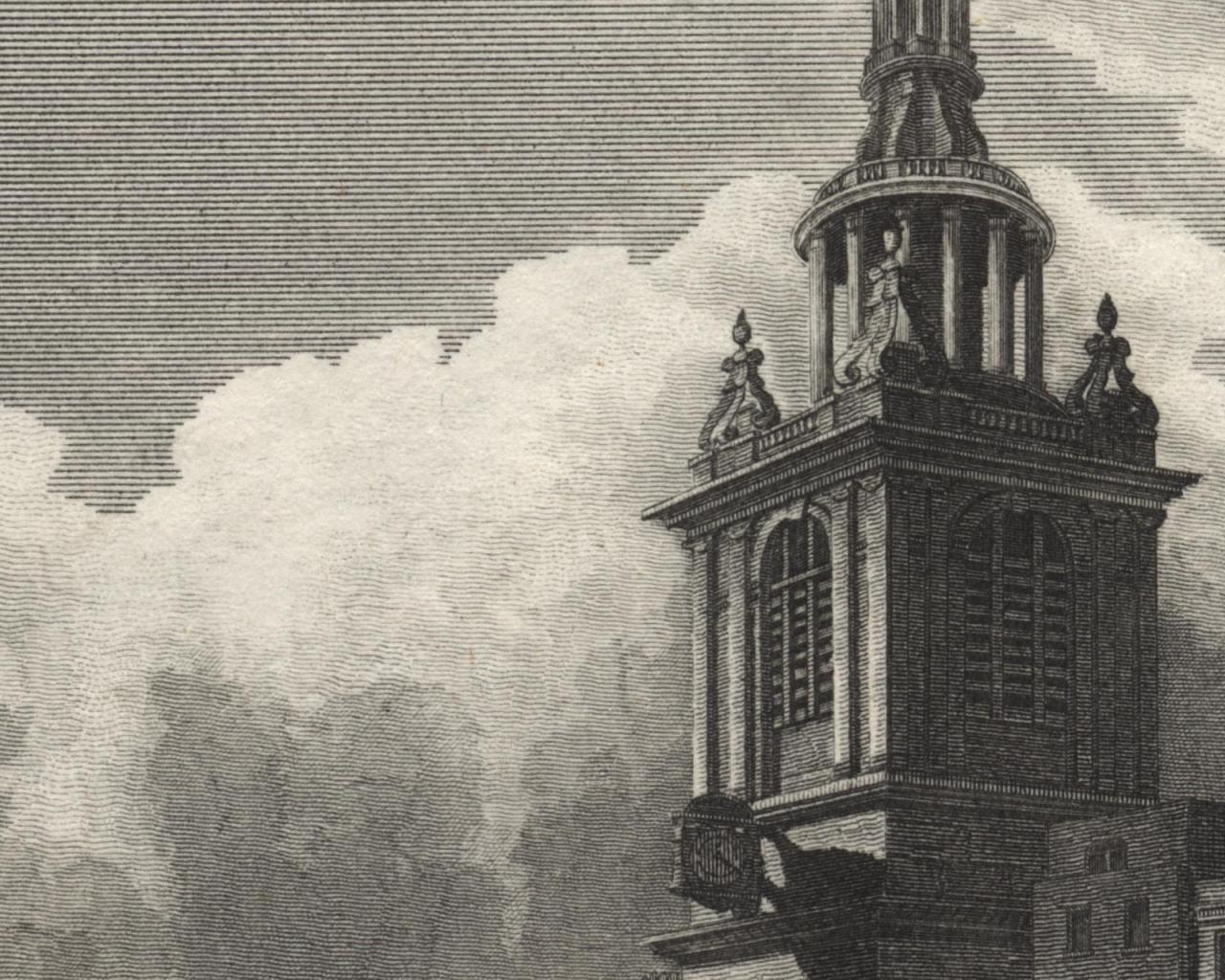 Here's a 800x600 clipping focusing on just the lower part of the steeple in the above steel engraving of the Bow Church.
